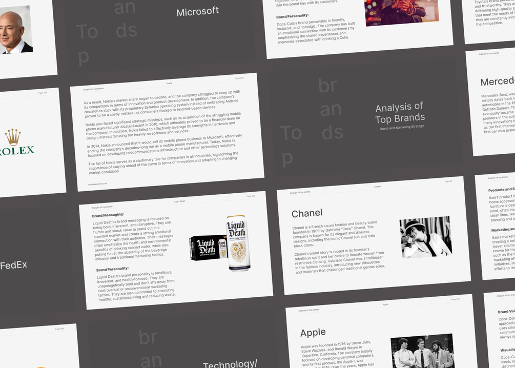 This is the analysis of some top brands' brand and marketing strategies in a 263-page document. A case study of how top brands built their brand from zero ground.